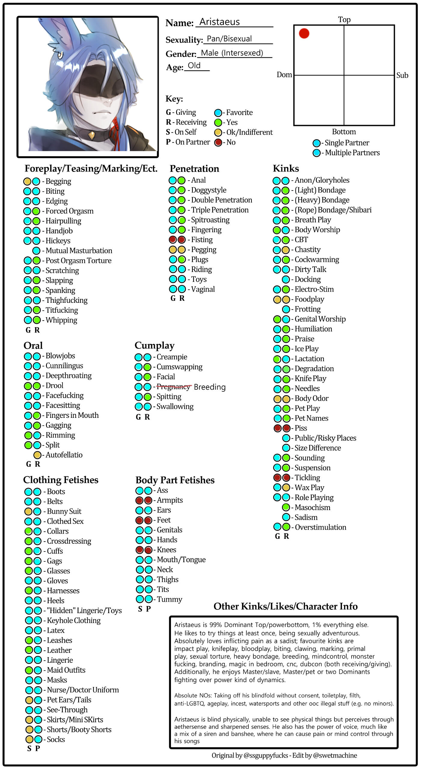 Here's Aristaeus' kink list! Please click on it for full view. Communication and ooc consent are very important to me so please do talk to me if you have any limits. Additionally, Aristaeus is an intersexed male with a functioning penis and vagina, allowing him to procreate in both ways.Aristaeus' safeword is 'Heartflower'.